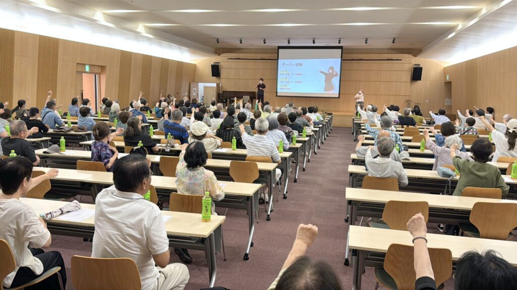 当日は南港・海の町にお住まいの65歳以上の高齢者156名の皆さまがご参加くださり、渡辺の掛け声に合わせて、明るく・楽しく・元気よく体操を行ってくださいました。会場には笑顔と活気があふれ、終始和やかな雰囲気に包まれていました。